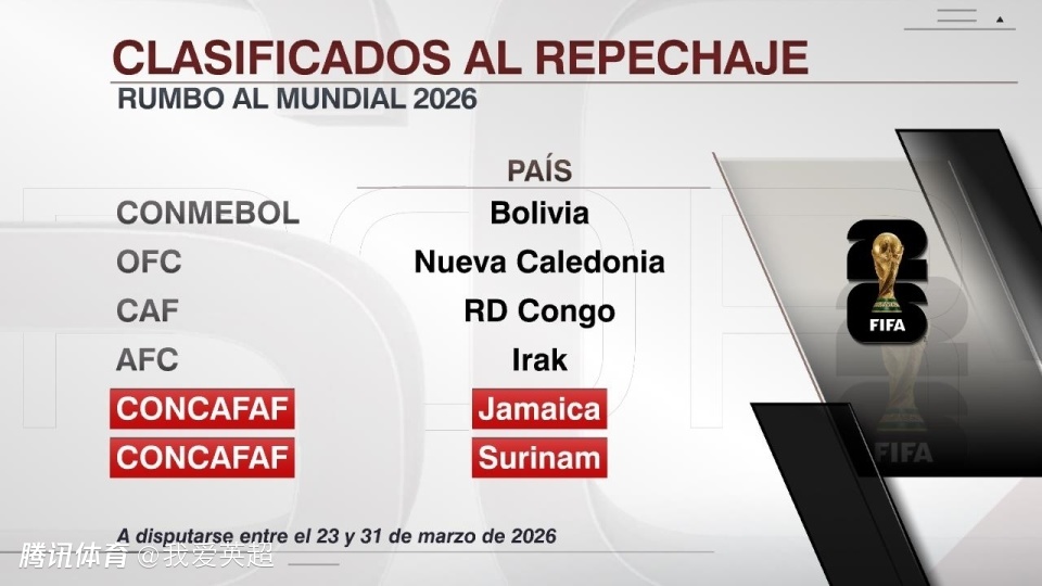 如此一来,参加洲际附加赛的6支球队全部出炉。分别是伊拉克(FIFA第57)、民主刚果(FIFA第60)、牙买加(FIFA排名第68)、玻利维亚(FIFA第76)、苏里南(FIFA排名第126)、新喀里多尼亚(FIFA第143)。