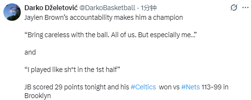 2025-11-19 12:50北京时间11月19日,NBA常规赛继续进行,凯尔特人队113-99击败篮网队。杰伦-布朗此役出战32分钟,19投9中得到29分4篮板4助攻。赛后,他接受媒体采访。