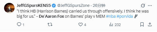 在谈到巴恩斯关键时刻的表现时,福克斯说道:“我认为巴恩斯在进攻端为我们扛起了重任,他对我们而言发挥了关键作用。能把投篮效率保持在这个水准,我觉得很多人都能从巴恩斯身上学到不少东西。”