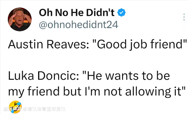 随后里夫斯也走过来,向东契奇说道:“干得漂亮,我的朋友。”东契奇则是打趣回应:“他想成为我的朋友,但我并不允许。”记者随后追问:“他得做些什么才能成为你朋友?”东契奇表示:“没有,他啥也干不了。”