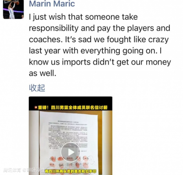 对此,上赛季效力于四川男篮的外援马里奇转发了四川男篮集体讨薪的行为,并且也配文讨薪表示:“我希望能有人站出来承担责任,支付所有球员与教练的薪水。很遗憾,我们去年在那样的情况下,仍然拼尽全力去比赛。我只知道我们这些外援,也没有拿到应得的薪水。”