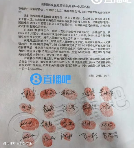 2025-11-19 17:20北京时间11月19日,在CBA新赛季已经来临之际,四川男篮球员、教练与工作人员联名写信,向中国篮协、CBA公司和四川省体育局发布联名信(联名信外表神似昔日国青“血书门”),请求尽快解决四川男篮的长期欠薪问题。如今上赛季效力四川男篮的外援马里奇也通过社媒讨薪,表示四川男篮也欠了他们所有效力外援的薪水没有支付。