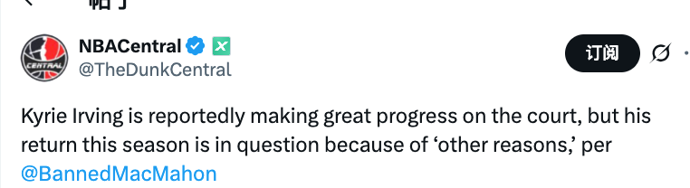 2025-11-20 01:00北京时间11月20日,据名记麦克马洪报道,欧文在球场上的恢复进展十分顺利,但因“其他原因”,他本赛季能否回归仍存疑。