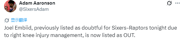 据悉,恩比德此前因右膝伤病管控,被列为76人对阵猛龙一战的出战成疑球员,目前其出战状态已更新为确定缺席。