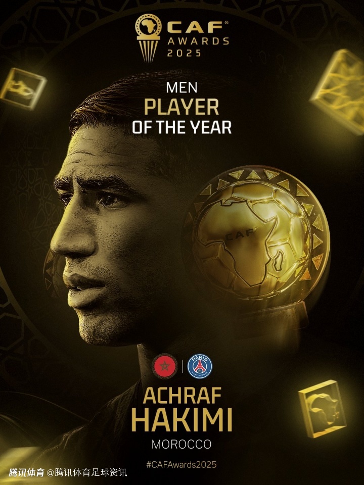 官方:阿什拉夫力压萨拉赫、奥斯梅恩 当选2025非洲足球先生