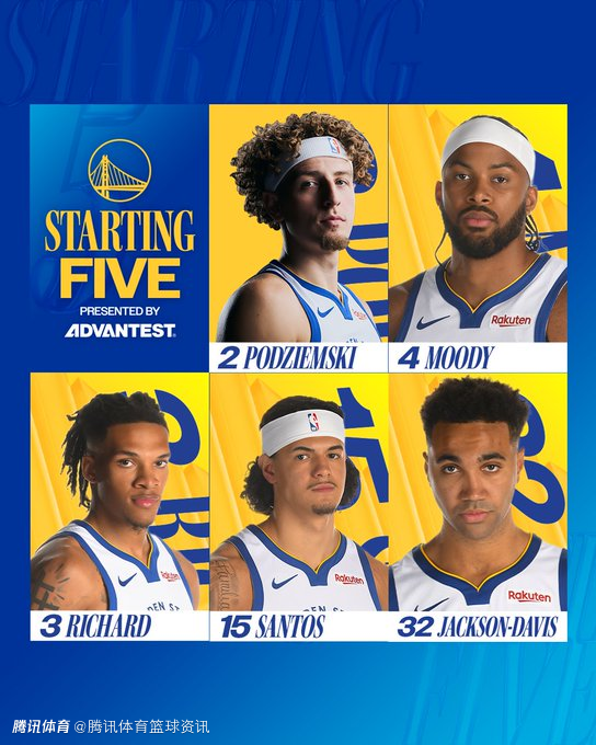 勇士本场首发五人为:波杰姆斯基、穆迪、理查德、桑托斯、杰克逊-戴维斯。