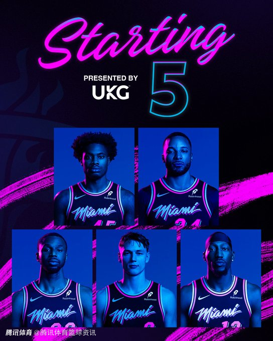 热火本场首发五人为:达维昂-米切尔、鲍威尔、拉松、维金斯、阿德巴约。