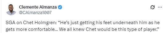 亚历山大在谈到切特-霍姆格伦时表示:“随着他对比赛越来越适应,状态也在逐渐步入正轨,我们早就知道,切特会成长为这样的球员。”