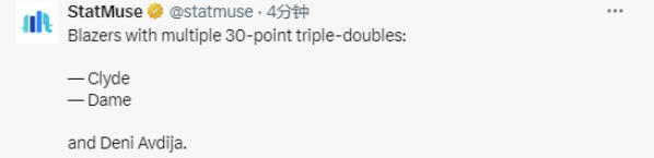 根据数据统计显示,在开拓者队的历史上,只有德雷克斯勒、利拉德和阿夫迪亚曾多次砍下过得分30+的三双。目前阿夫迪亚的30+三双次数可以排在队史并列第二位。