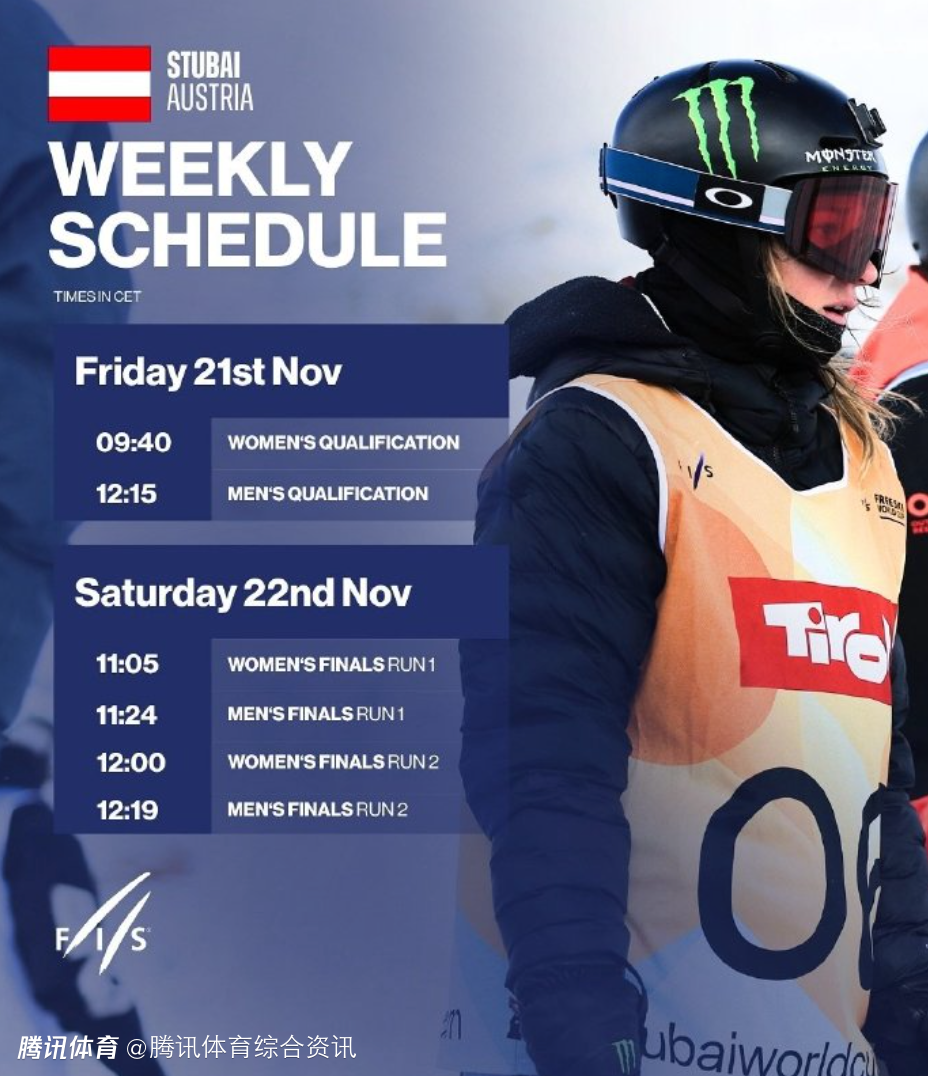 25-26赛季自由式滑雪坡面障碍技巧世界杯奥地利施图拜站的赛事于11月19日开启训练,22日进行男女组资格赛,23日展开决赛,且赛事时间均为当地时间,具体安排如下: