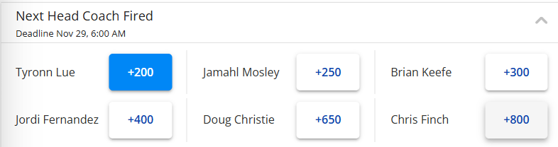 2025-11-20 18:50鹈鹕的威利-格林成为本赛季第一位正式被炒的主教练(注:比卢普斯仍在调查中,尚未被解雇),那么下一个丢掉饭碗的主教练会是谁?北京时间11月20日,相关赔率出炉,快船主帅泰伦-卢成为下一位被炒主帅的头号热门,排名第二的是魔术主帅莫斯利,位居第三的是奇才主帅基夫。以下是前六具体排名和赔率——