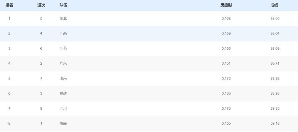 湖北队以38秒60的成绩获得了男子4×100米接力金牌,江西队以38分64的成绩获得银牌,江苏队38秒68获得铜牌,广东队38秒71获得第4名。