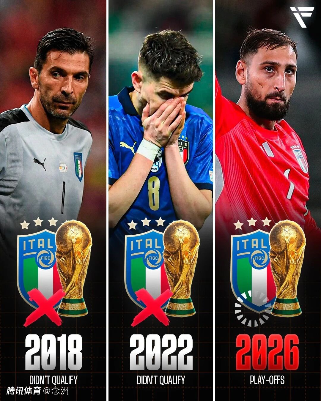 对于最受关注的意大利来说,如果半决赛输给北爱尔兰,就直接连续三届无缘世界杯;如果赢了,那么还需要在决赛战胜威尔士或者波黑,才能重返世界杯。