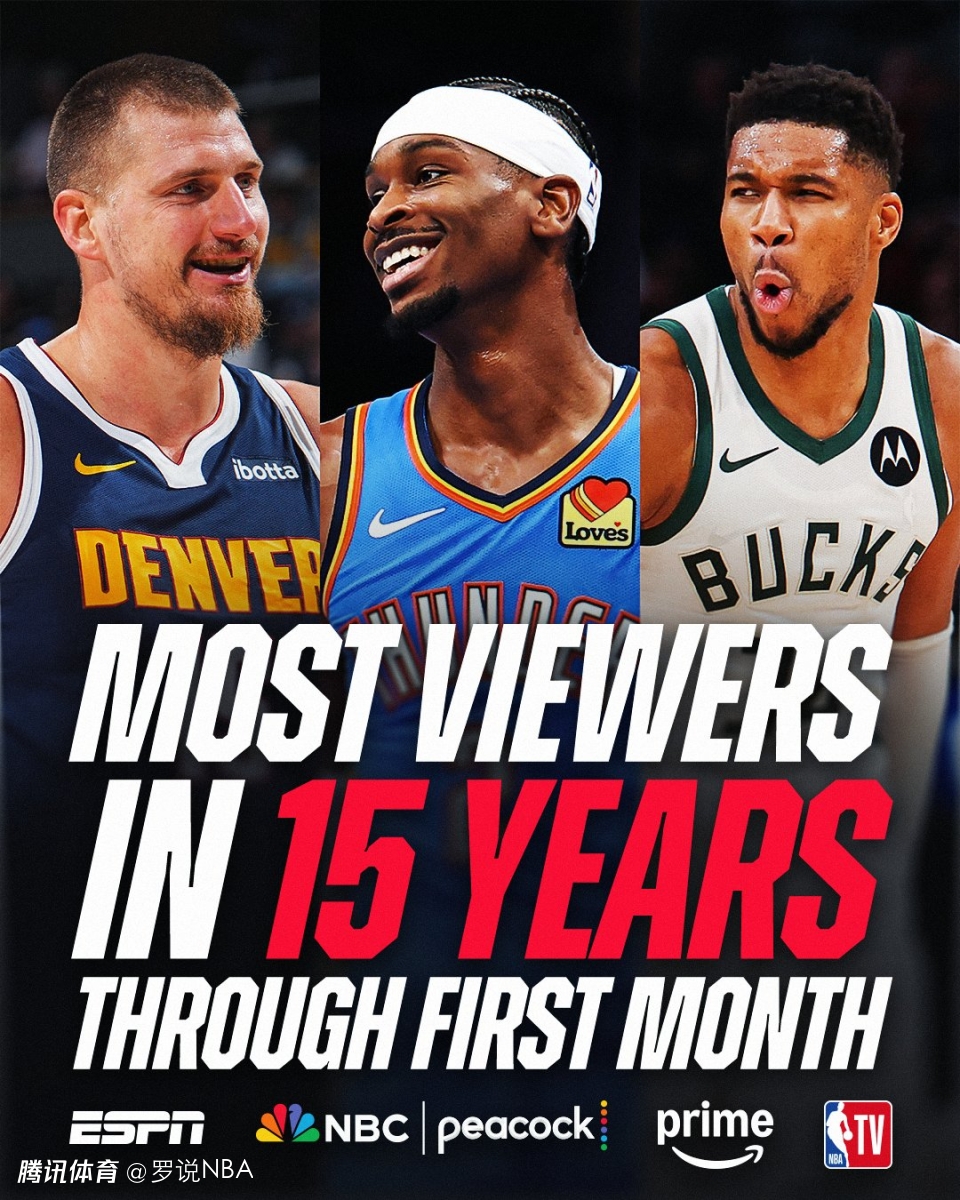 2025-11-21 06:40北京时间11月21日,NBA官方宣布,常规赛首个月期间,在NBC、Peacock、亚马逊以及ESPN播出的NBA全国性赛事,观众总人数已超6000万,联盟同时指出这是15年来赛季开局阶段的最高收视纪录。