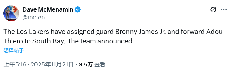 2025-11-21 07:00北京时间11月21日,湖人官方宣布,后卫布朗尼-詹姆斯与前锋阿杜-蒂耶罗已被下放到球队的G联盟附属球队南湾湖人。