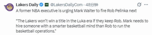 2025-11-21 09:20北京时间11月21日,根据Lakers Daily报道,在洛杉矶湖人队解雇乔伊-巴斯与杰西-巴斯后,一位曾与佩林卡有过多次业务往来的前NBA高管表示,球队老板马克-沃尔特的下一步动作应当是解雇篮球运营总裁佩林卡。