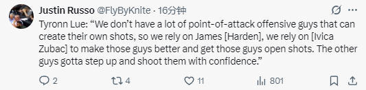 泰伦-卢说道:“我们队中擅长持球发起进攻、能自主创造投篮机会的球员并不多,所以我们得依靠詹姆斯-哈登,也得依靠祖巴茨来带动队友,为他们创造空位投篮机会。其他球员则必须站出来,带着信心把球投进。”