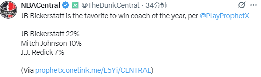 2025-11-21 11:10北京时间11月21日,体育预测媒体ProphetX发布了NBA年度最佳教练员的最新获奖概率,活塞队主教练小比克斯塔夫以22%的概率位列首位。