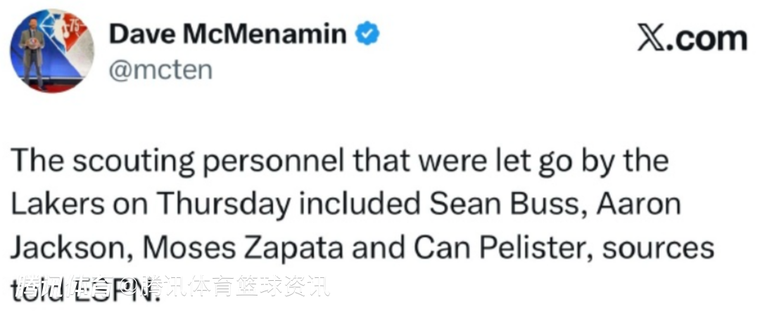 2025-11-21 11:20北京时间11月21日,据湖人队记Dave McMenamin报道,被湖人解雇的球探分别是肖恩-巴斯、阿隆-杰克逊、摩西-帕萨塔、坎-佩里斯特。值得一提的是,被解雇的球探之一阿隆-杰克逊,此前曾在CBA的北京首钢、浙江广厦效力过。