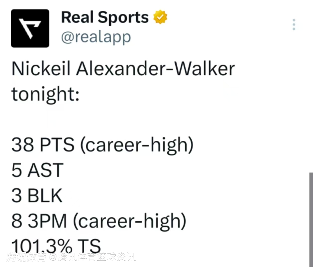 根据数据统计显示,本场38分是亚历山大-沃克职业生涯得分新高,命中8记三分同样创生涯新高。