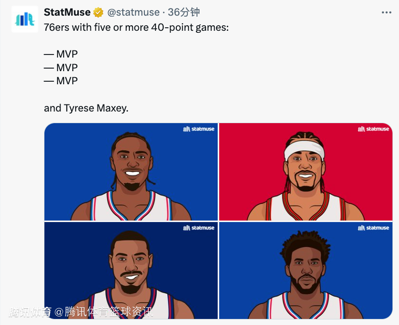 此役过后,76人历史单场40+得分场次达到5场及以上的球员包括艾弗森、恩比德、张伯伦和马克西。另外,本赛季单场得分40+达到3场及以上的球员包括东契奇、马尔卡宁、库里和马克西。