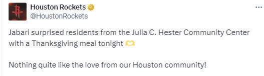 火箭队官方还发文写道:“今晚,小贾巴里-史密斯为社区中心的居民们送上了感恩节大餐,这份惊喜让大家十分意外。休斯顿社区给予的这份关爱,真是无比珍贵!”