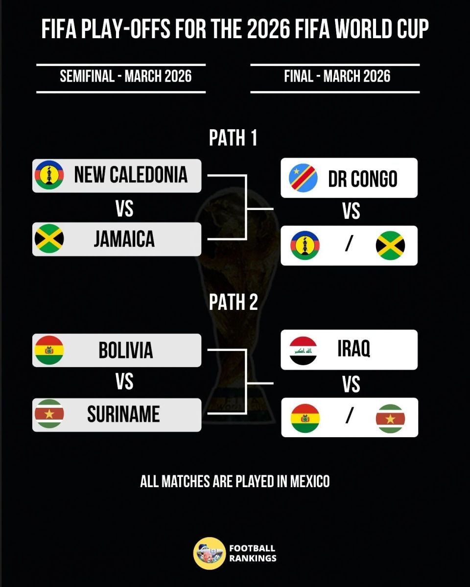洲际附加赛另一组,民主刚果抽到上签,新喀里多尼亚先与牙买加交手,民主刚果以逸待劳,有望1974年之后时隔52年重返世界杯。这是非洲球队首次参加洲际附加赛,中北美球队此前7次洲际附加赛3胜4负,加勒比海球队仅参加1次,是特立尼达和多巴哥击败巴林出线(2006年)。这次中北美两队参赛,期待创造历史。