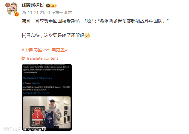 2025-11-22 00:40韩国男篮一哥李贤重回国后接受采访时表示:“希望两场世预赛都能战胜中国队。”在被中国男篮打哭两次后,李贤重看起来依然有信心。