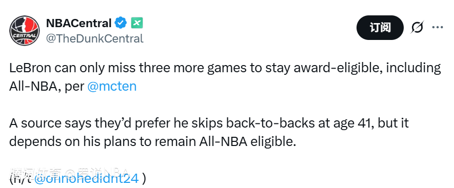 Dave也谈到了评奖的问题。“从现在到常规赛结束,勒布朗最多只能再缺席3场比赛,才能获得包括最佳阵容在内的奖项评选资格。他已经连续21年入选最佳阵容。今天沟通的消息人士表示‘说实话,对于一位41岁的球员,我更希望勒布朗能放弃背靠背比赛,但最终这还要看他是否仍计划冲击再次入选最佳阵容’。