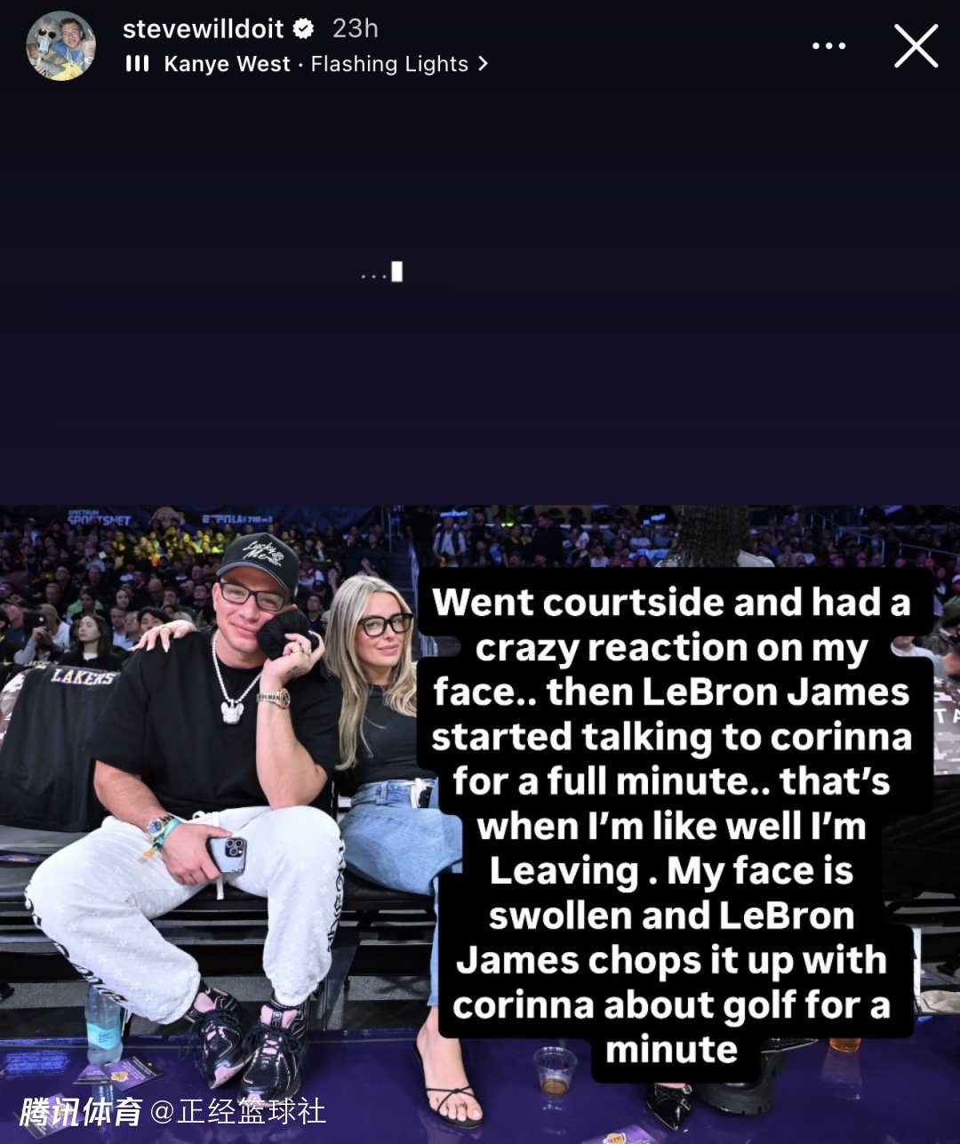 此外,SteveWillDoIt还说他和女友一起去看湖人队的比赛,然后他的脸过敏了,但是詹姆斯和女友聊起了高尔夫。当时他就想离开,因为脸已经肿了,但是詹姆斯和他的女友还在聊高尔夫。