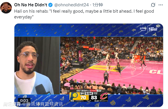 2025-11-22 10:30北京时间11月22日,NBA杯赛继续进行,步行者对阵骑士。正处于恢复期的步行者球星哈利伯顿在比赛进行时接受场边采访,谈及自己的伤情进展。