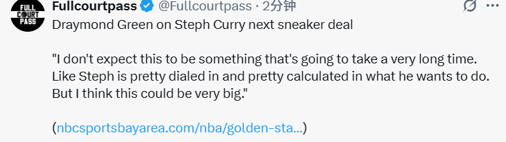 2025-11-22 10:50北京时间11月22日,勇士队球员德雷蒙德-格林在个人播客节目中谈到了队友库里,他表示库里达成下一份球鞋合同不会花费太长时间。