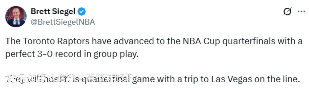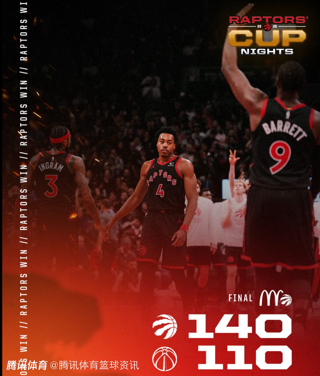 2025-11-22 11:20北京时间11月22日,NBA杯小组赛,猛龙以140-110大胜奇才,以3胜0负的战绩晋级1/4决赛(首支晋级1/4决赛的队伍),他们之后将在主场出战1/4决赛的比赛,胜者将会前往拉斯维加斯打接下来的NBA杯比赛。