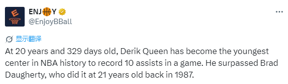 2025-11-22 12:10北京时间11月22日,NBA杯赛继续进行,鹈鹕对阵独行侠。本场比赛中,鹈鹕新秀德里克-奎因表现出色,比赛还没结束时,他已刷出单场11次助攻,以20岁329天的年纪成为NBA历史上最年轻的单场送出10次以上助攻的中锋球员。他超越了1987 年以21岁之龄达成该成就的布拉德-多尔蒂。