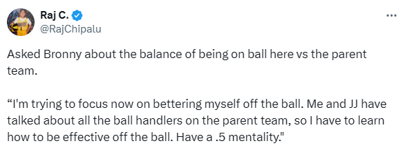 谈及如何平衡在G联盟与湖人队的打球模式,布朗尼表示:“我正专注提升无球能力,已和雷迪克深入讨论过母队的持球手,所以必须学会在无球状态下发挥效用,要保持两边各50%的心态。”