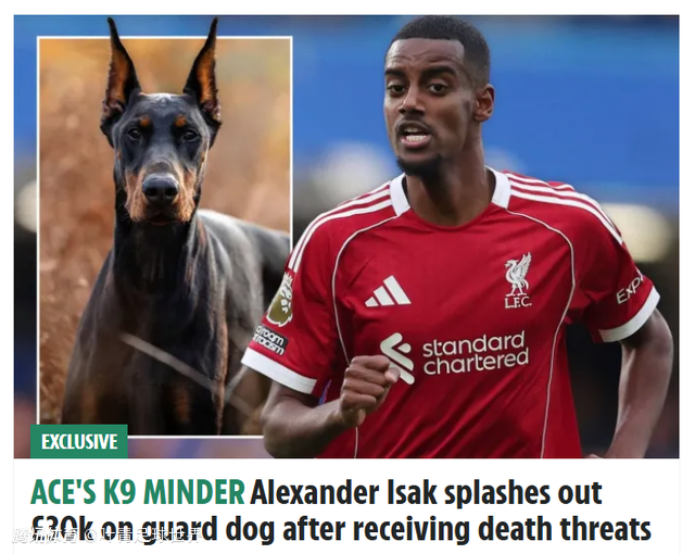 2025-11-22 15:3026岁的伊萨克,今年夏天从纽卡加盟利物浦,转会费高达1.45亿欧元(1.3亿英镑),是英超历史标王。11月22日,英国《太阳报》独家爆料,遭到死亡威胁的伊萨克,花3万英镑买下一只杜宾犬,守卫自己和家人的安全。