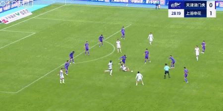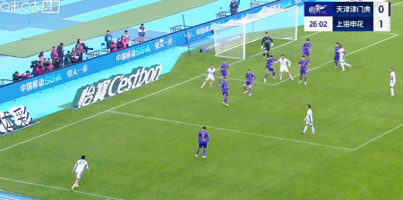 第14分钟,哈达斯主罚任意球送入禁区,津门虎攻门被申花后卫挡出底线。