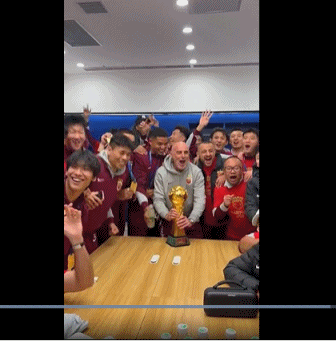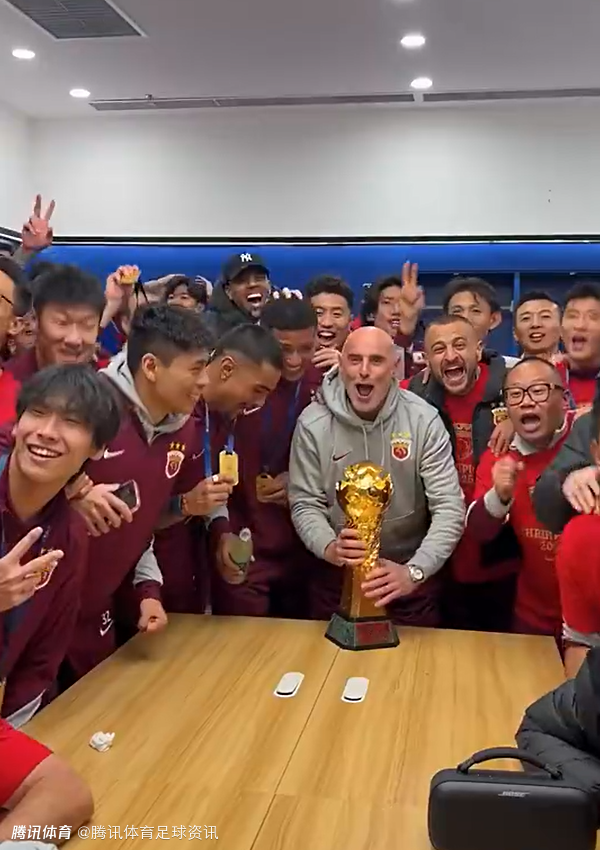 赛后的海港更衣室里气氛热烈,全员歌唱庆祝夺冠,主帅穆斯卡特手握中超火神杯站在中央,有队员和教练直接兴奋地拿起瓶子泼洒饮料。