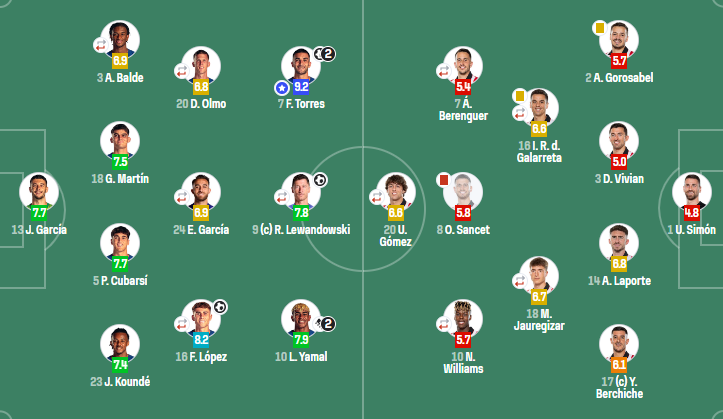 巴塞罗那(4-3-3):霍安-加西亚;孔德,库巴西,赫拉德-马丁,巴尔德(46'阿劳霍);费尔明(65'卡萨多),埃里克-加西亚(74'贝尔纳尔),奥尔莫(81'拉菲尼亚);亚马尔,莱万多夫斯基(65'德罗-费尔南德斯),费兰-托雷斯
