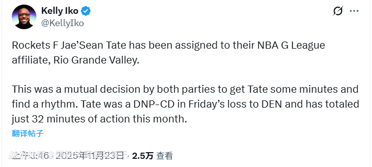 Kelly Iko透露,此次下放是火箭与泰特共同协商的结果,目的是让这位30岁的前锋获得更多出场时间,以找回比赛节奏。尽管球队另两位前锋多里安-芬尼-史密斯和塔里-伊森均有伤在身,但泰特在过去三场比赛中两次被列为健康DNP(未激活参赛),仅有的一次登场也仅出战2分钟。