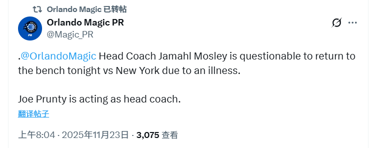 2025-11-23 08:20北京时间11月23日,NBA常规赛继续进行,魔术对阵尼克斯。本场比赛中,魔术主帅莫斯利突发疾病。