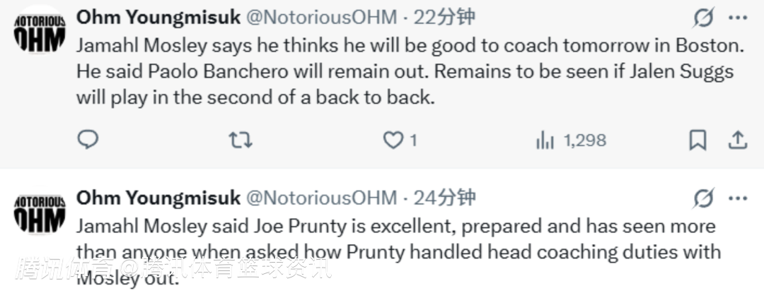 另外,莫斯利也表示,他应该能在明天对阵凯尔特人的比赛正常执教。他还称班凯罗将继续缺阵,萨格斯是否出战这场背靠背的比赛仍有待确定。