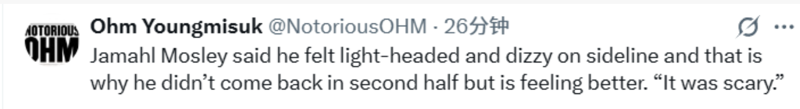 莫斯利透露,他在场边出现了头晕目眩的症状,因此未能执教下半场比赛,但目前感觉有所好转,莫斯利表示:“当时情况挺吓人的。”当被问及乔-普伦蒂在自己缺阵期间担任临时主帅的表现时,莫斯利表示:“普伦蒂很出色、准备充分,他的经验比任何人都丰富。”