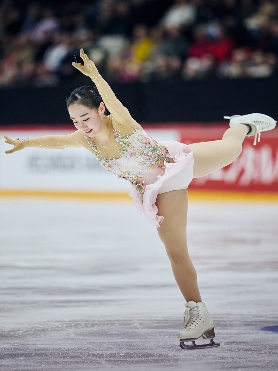 后半段接续步与编排步伐直接相连,表演非常抓人;即便被几个跳跃被指出周数不足,可这套雅致细腻的节目,还是拿到144.33(技术74.43/节目内容69.90),合计217.22摘金。
