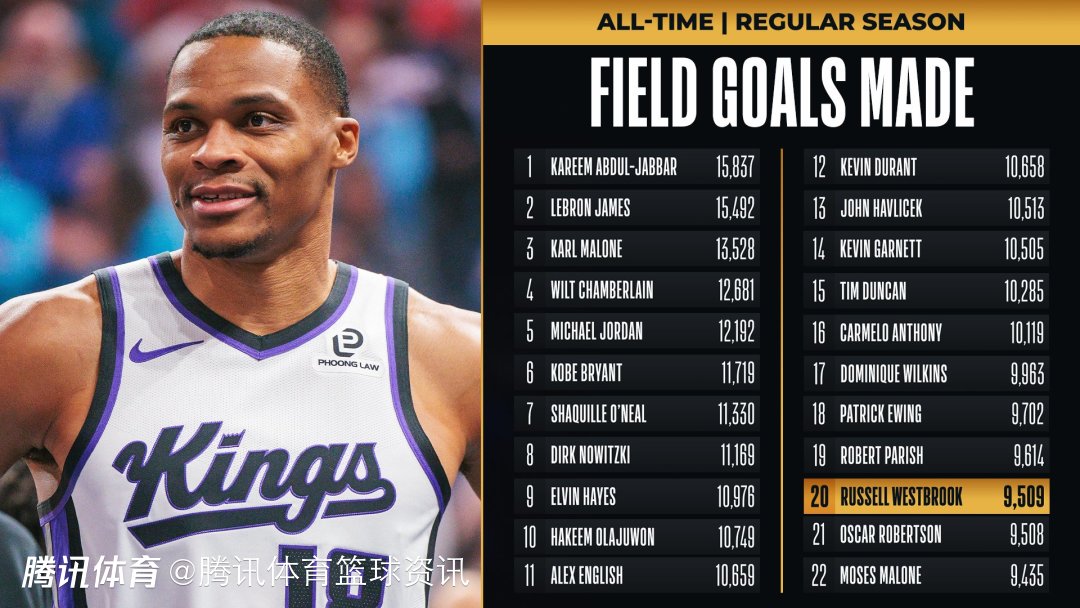 里程碑!威少9509个运动战进球超越大O 升至NBA历史第20位