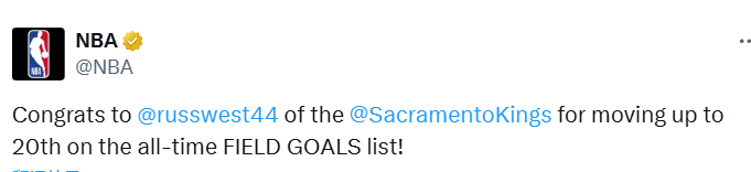 2025-11-23 11:50北京时间11月23日,NBA常规赛继续进行,国王队对阵掘金队。首节比赛结束前6分50秒,威斯布鲁克命中个人本场第3个运动战进球,生涯运动战总进球数达到9509个,超越奥斯卡-罗伯特森,升至NBA历史第20位。
