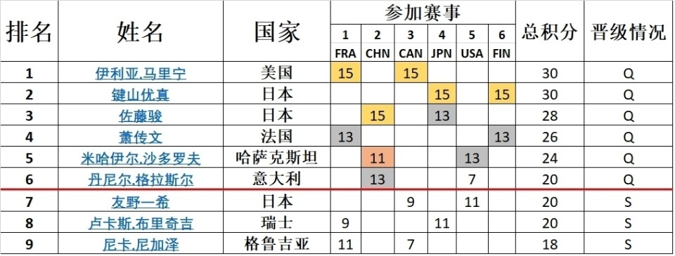 值得一提的是,在美国站拿到冠军的法国名将阿莫兹,由于第一站排在第十,没有积分,导致他最终排在第12位,同样无缘总决赛。