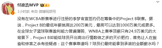 媒体人付政浩发文点评李梦加盟Project B联赛的话题表示:Project B的最低年薪就高达200万美元,最高可以达到1000万美元或更多。在全球女子篮球联赛盈利能力普遍薄弱、WNBA上赛季顶薪只有24.9万美元的大背景下,Project B却能给球员开出高出行情数倍之多的天价肥约,难免让人在振奋和惊喜之余有些疑虑:这个赛事靠谱吗?球员们最终能拿到承诺的全额薪水吗?