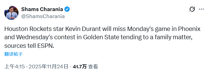 2025-11-24 05:20北京时间11月24日,据名记Shams报道,火箭球星凯文-杜兰特将因处理家庭事务缺席接下来两场比赛。
