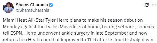 该记者写道:“据ESPN消息人士透露,迈阿密热火队全明星球员泰勒-希罗计划于周一(北京时间周二)在主场迎战达拉斯独行侠队的比赛中迎来赛季首秀,除非出现意外状况。希罗在9月末接受了脚踝手术,如今他回归时,热火队已取得4连胜,战绩提升至11胜6负。”